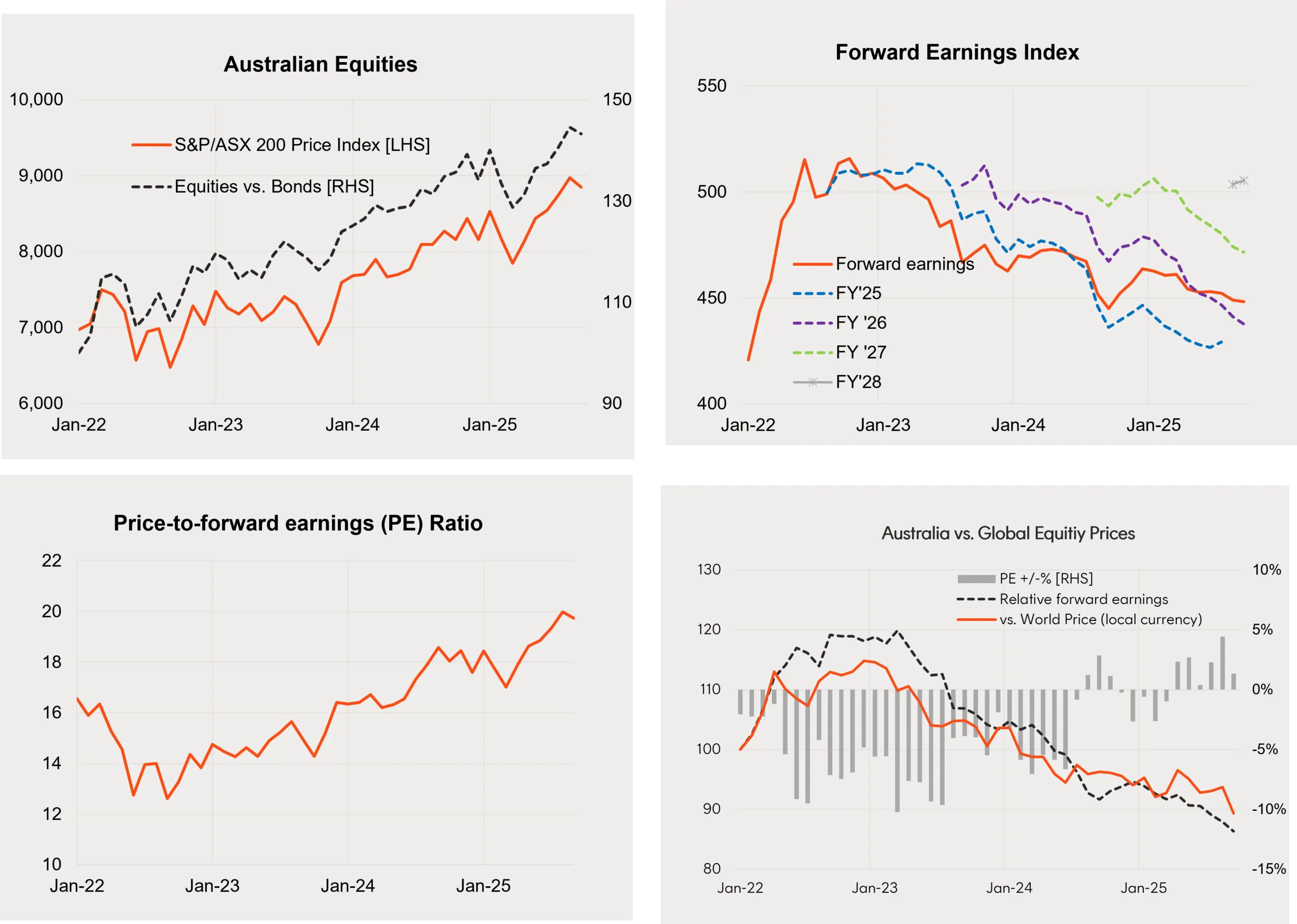 - Current earnings expectations imply 9% growth in Australian forward earnings by the end of 2026, which is somewhat less than that for global earnings. What’s more, Australian earnings expectations remain under downward pressure. Accordingly, with relative valuations fair, Australian equities still seem likely to underperform global equities over the coming year due to relatively weaker growth in earnings.