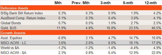 Source: Bloomberg, Betashares. Cash: Bloomberg Australian Bank Bill Index; Australian Bonds: Bloomberg AusBond Composite Index; Global Bonds: Bloomberg Global Aggregate Bond Index ($A hedged); Gold: Spot Gold Price in $US; Australian Equities: S&P/ASX 200 Index; Global Equities: MSCI All-Country World Index in local currency and $A currency (unhedged) terms. Past performance is not indicative of future performance.